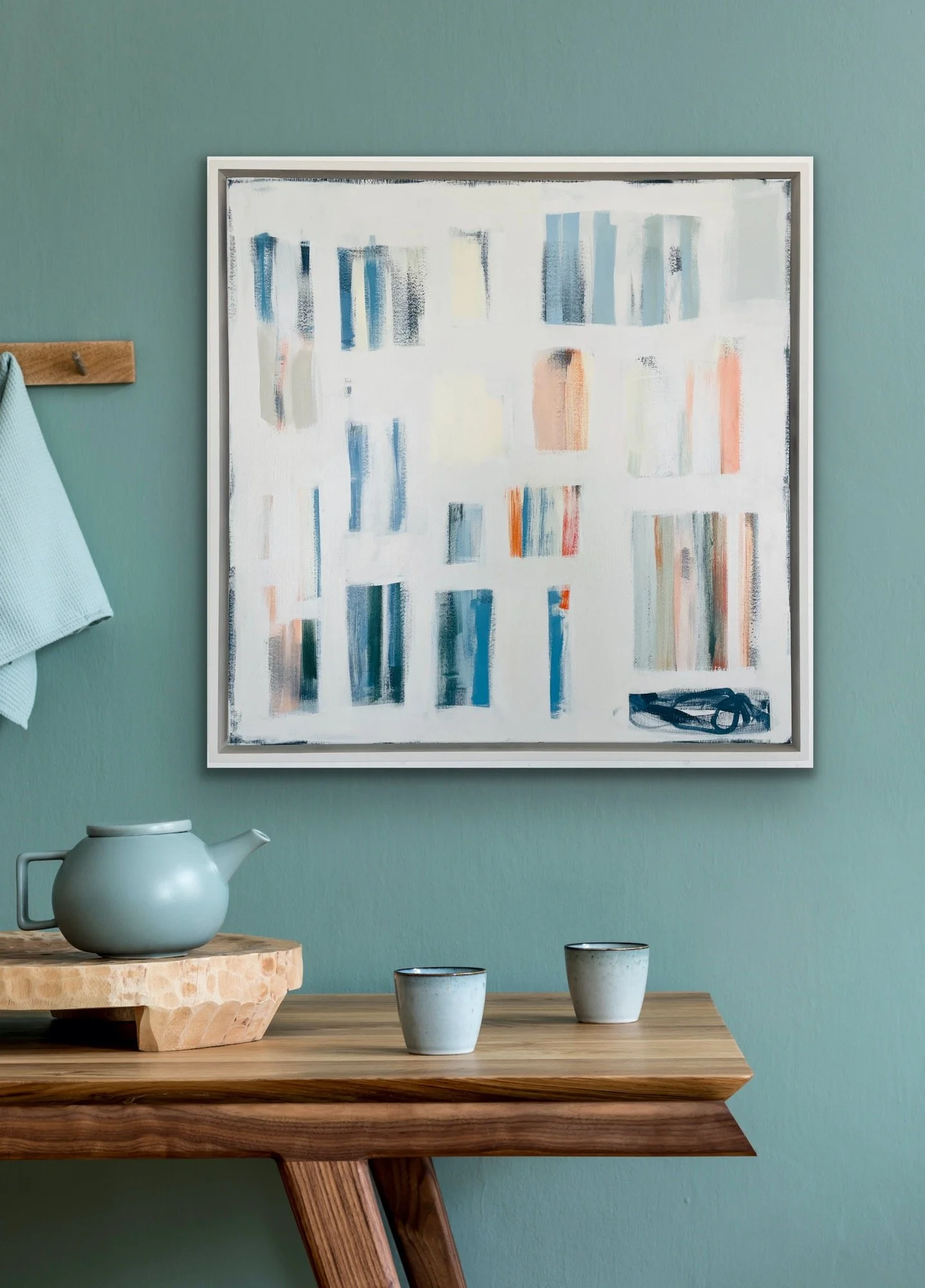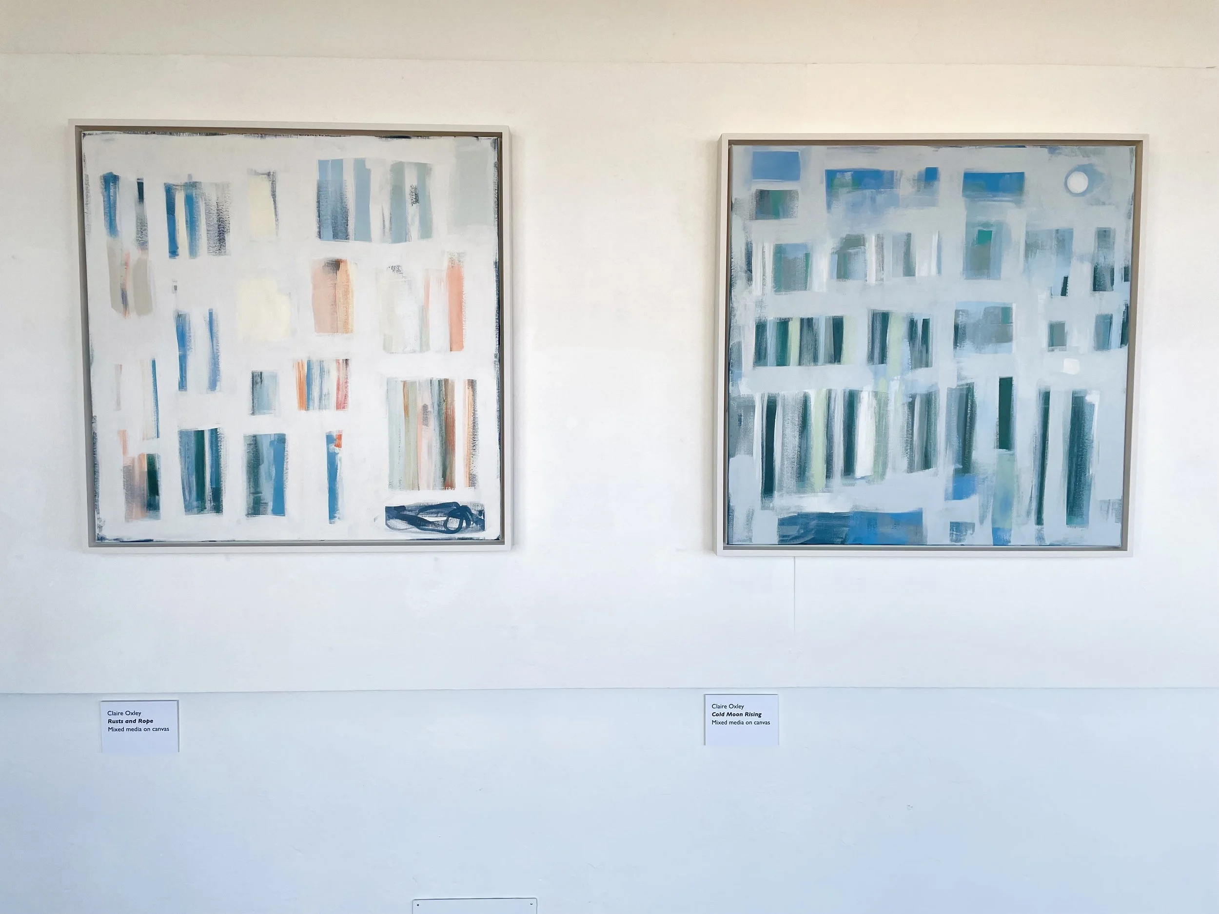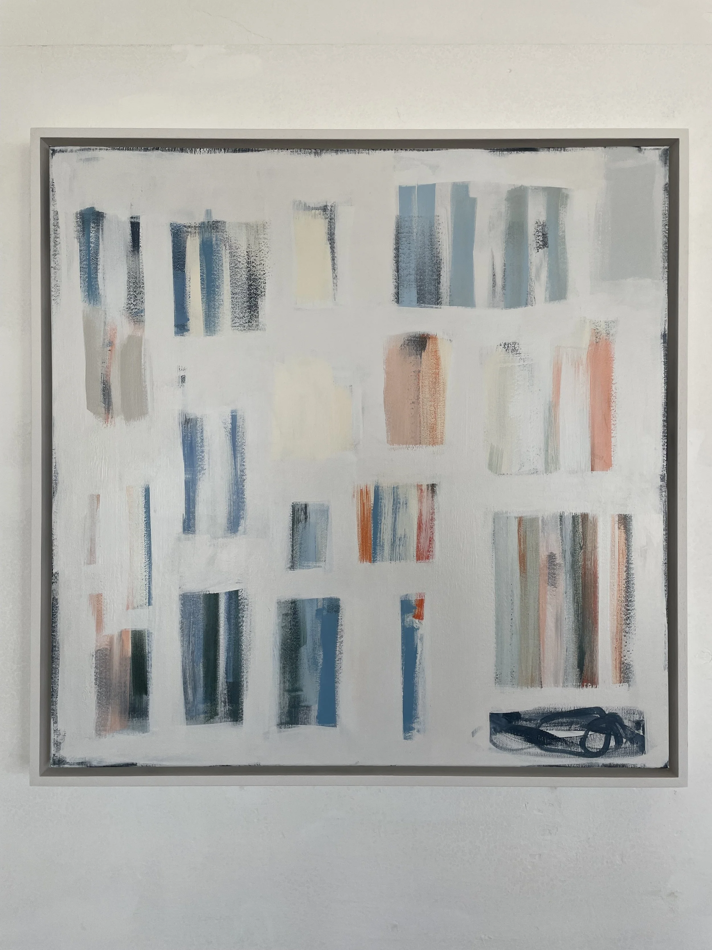 A boatyard, perhaps, where there are slices of this and that around, and the odd twist of well-worn, tarry binding. A painting for a modern aesthetic; bold hues are softened with whites and greys. Different textures add to the interest.