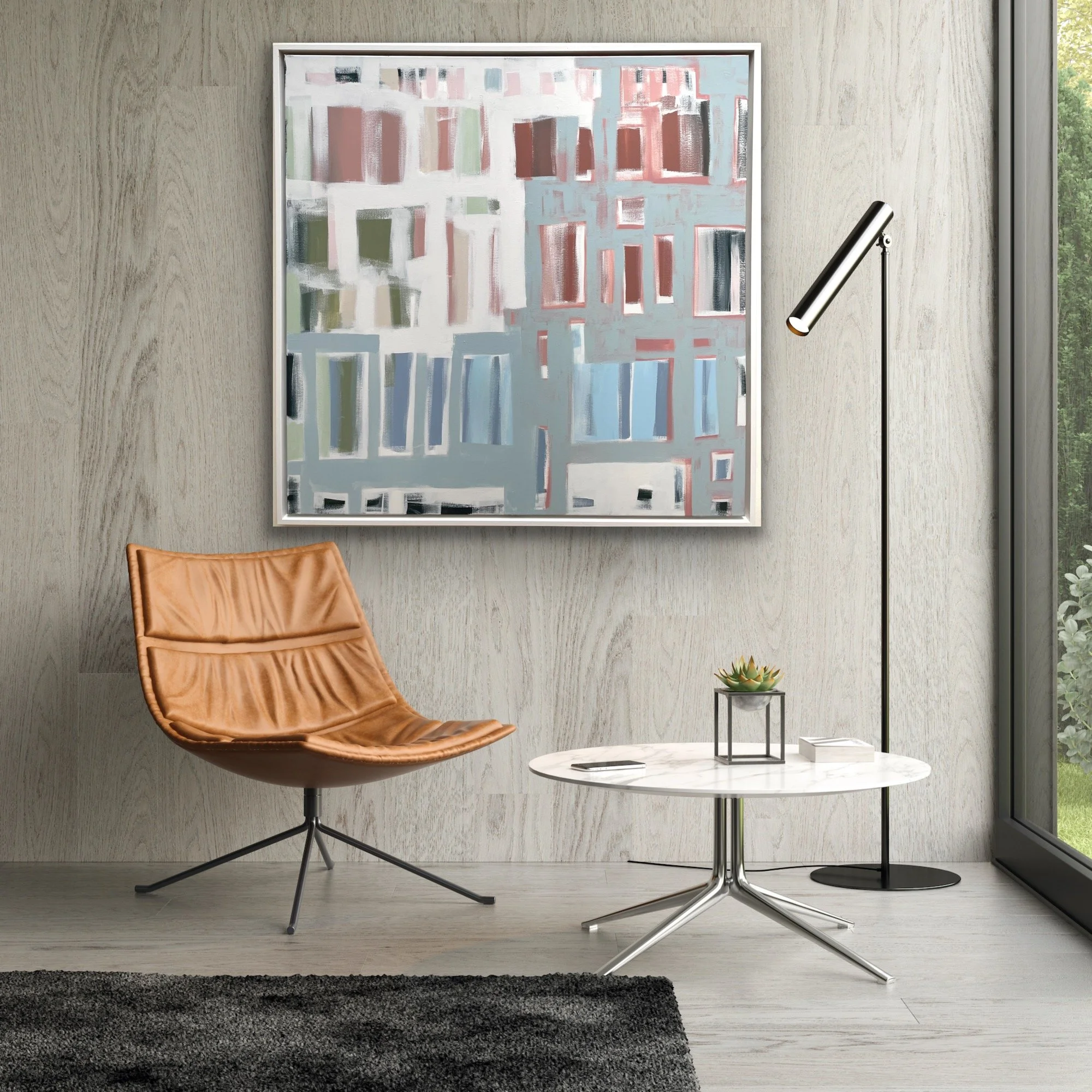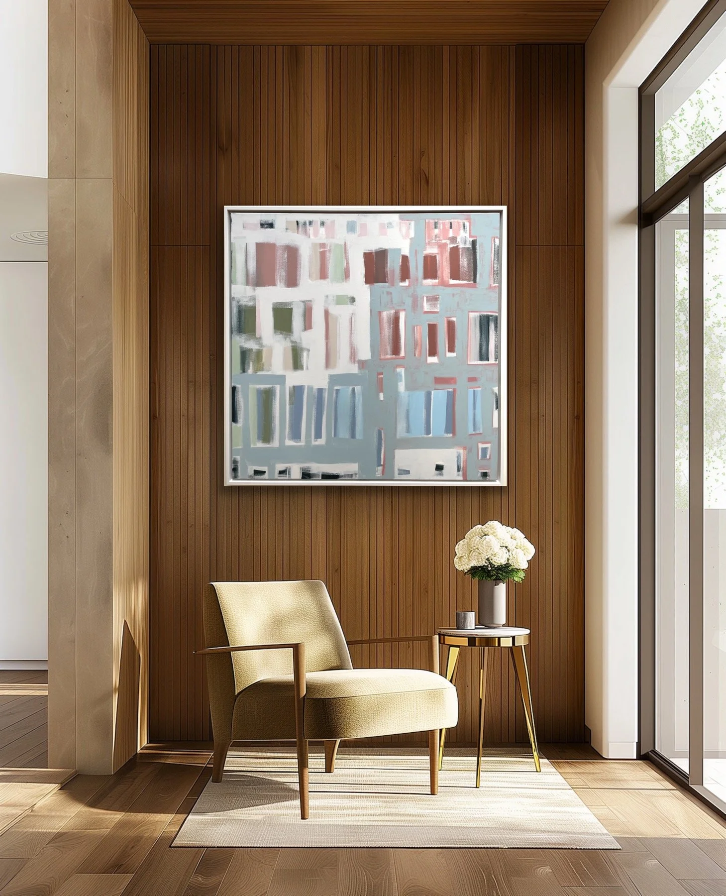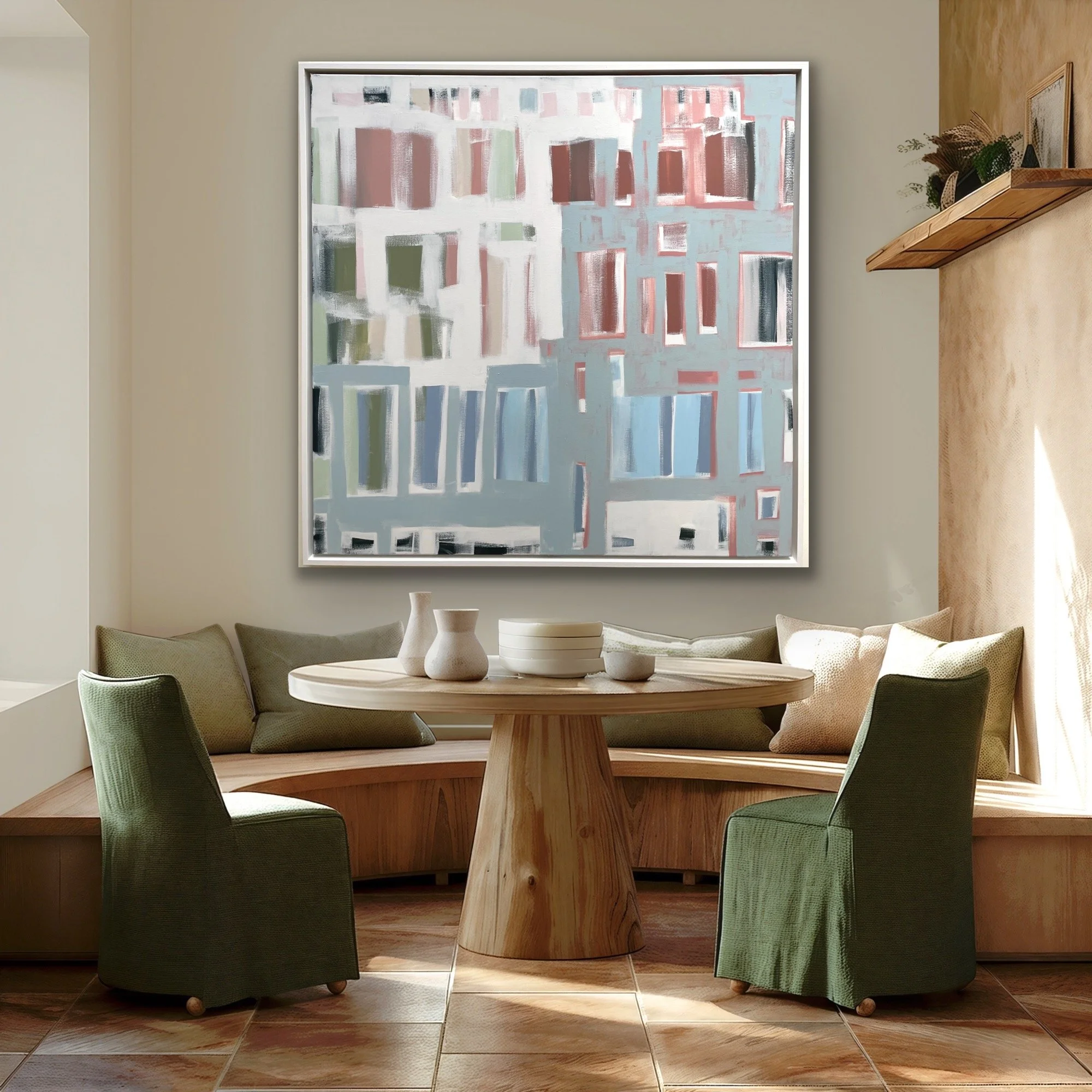 The slow, baked, settled last days of summer, flushed through with cooling water. Warm terracottas and accents of dark tones are balanced with blues and pinks. This painting would suit lots of interior schemes, perhaps especially modern and contemporary ones.